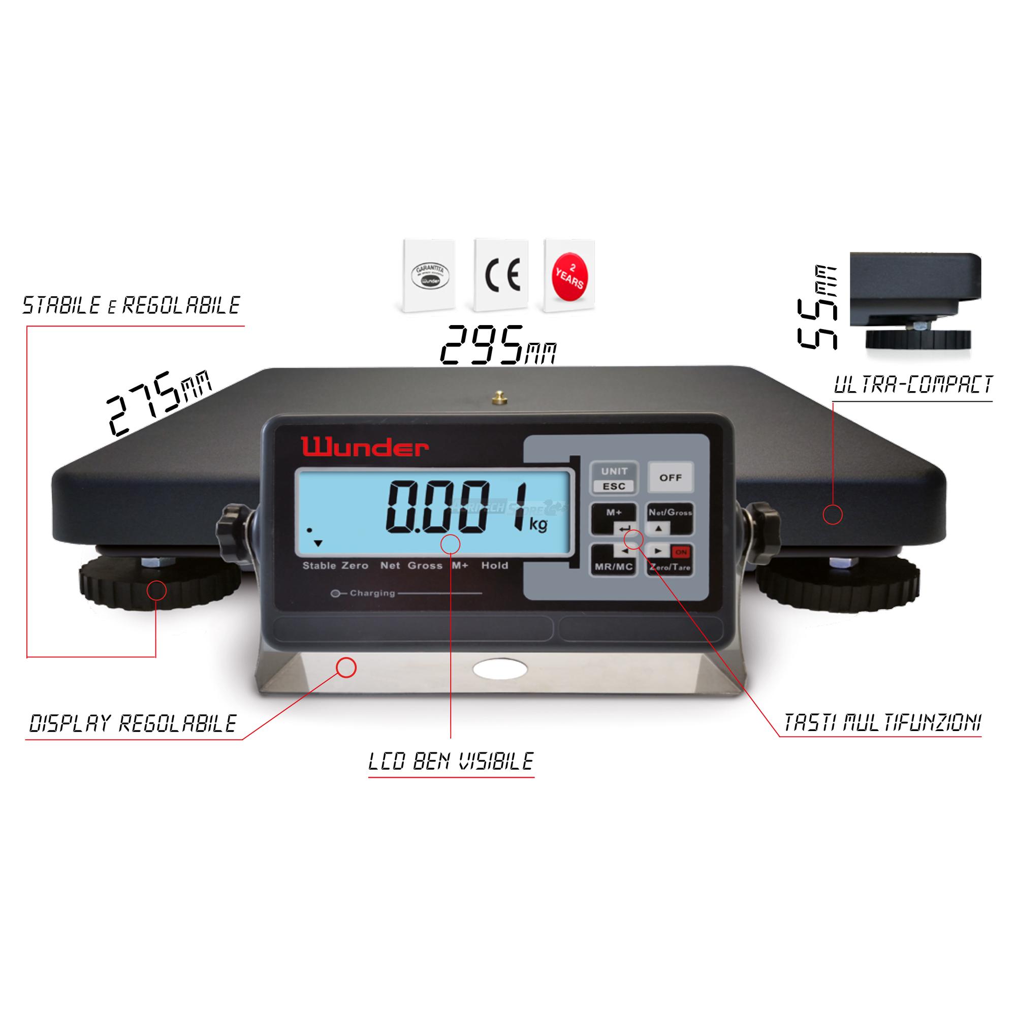 La bilancia WB 01229TM dispone di un piano di pesatura removibile e lavabile, display LCD retroilluminato per una facile lettura e alimentazione tramite batteria ricaricabile. Offre funzioni come tara semiautomatica, contapezzi, sommatoria, calibrazione esterna e autospegnimento programmabile, il tutto in una struttura robusta e leggera in alluminio rinforzato.