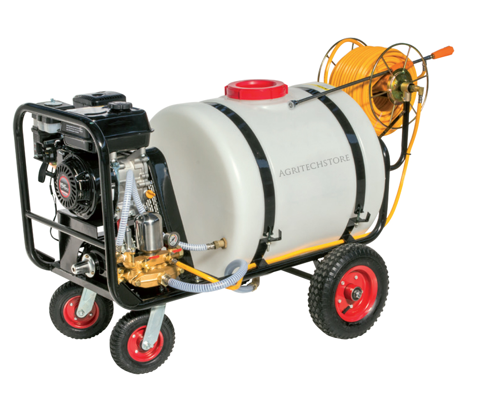 Carriola a 4 Tempi Wortex, con motore Loncin G 200 (C140-T4L) o motore Honda GX 200 (C140-T4H) e pompa a 3 pistoni, con serbatoio in prolipopilene dalla capienza di 140 lt. Dotata di 2 ruote pneumatiche fisse e 2 ruote pneumatiche mobili per facilitarne il trasporto, con autoavvolgente in acciaio e tubo da 30 Mt.