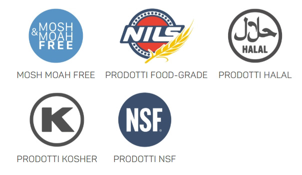 specifiche FDA 21 CFR 178.3570, certificati NSF H1, HALAL e KOSHER. COMPRESS SYNT FOOD 68 è privo di
