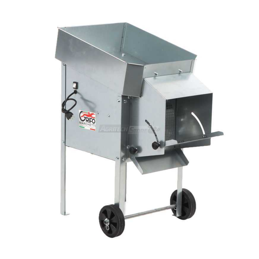 La defogliatrice per olive DEFP funziona sfruttando un flusso d’aria generato da un ventilatore interno, azionato da un motore elettrico da 0,3 HP. Quando le olive vengono versate nella vasca superiore, il ventilatore separa le foglie e i rametti più leggeri dalle olive, che invece cadono pulite nella parte inferiore. Il carter regolabile consente di controllare la direzione e l’intensità del getto d’aria per ottimizzare la pulizia.