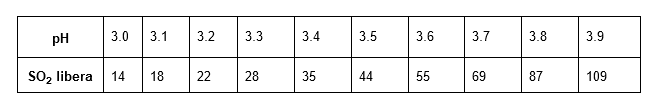 La SO2 libera dipende dalla quantità di SO2 aggiunta, da quella presente prima dell'aggiunta e da quella che si è legata subito. La SO2 libera esiste in due forme: bisolfiti (HSO3-), che è la forma predominante ma relativamente inefficace e la SO2 molecolare, la forma minore, responsabile della protezione del vino. La quantità di SO2 molecolare presente nel vino dipende dalla quantità di SO2 libera e dal pH. Solitamente 0.8 ppm di SO2 molecolare fornisce un'adeguata protezione contro l'ossidazione e la crescita di batteri. Per ottenere questo valore in un campione di vino che ha un pH di 3.2, occorrerebbero 22 ppm di SO2 libera. Se il valore di pH fosse a 3.5, sarebbe necessario raddoppiare la quantità di SO2 libera a 44 ppm.