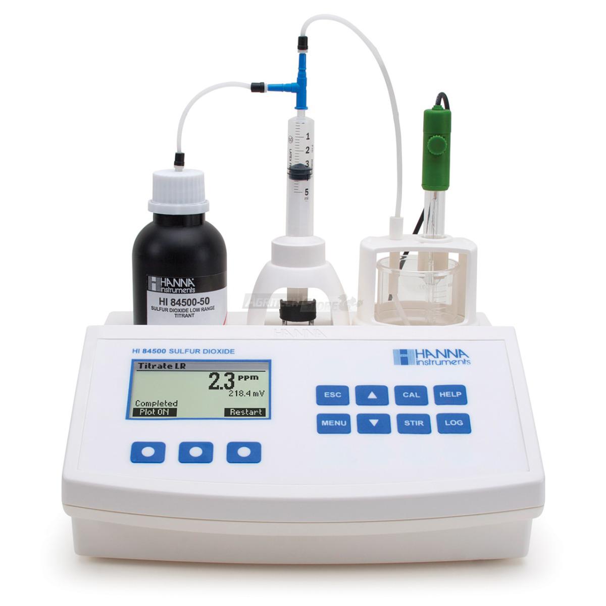 HI84500 è un minititolatore automatico, semplice e veloce, progettato per l'analisi di anidride solforosa (SO2) libera o totale nel vino. Basato sul metodo Ripper, questo minititolatore utilizza un metodo di analisi preprogrammato con un algoritmo che determina il completamento della reazione di titolazione mediante l'uso di un elettrodo ORP.