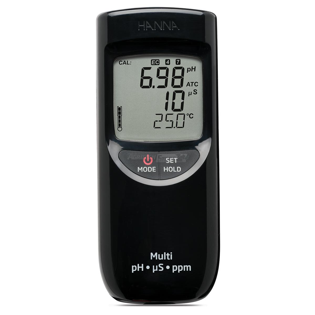 La calibrazione pH è automatica a uno o due punti con un set di soluzioni standard memorizzato (4.01/7.01/10.01 o 4.01/6.86/9.18) oppure ad un punto per pH ed EC on la soluzione di calibrazione rapida Hanna.
